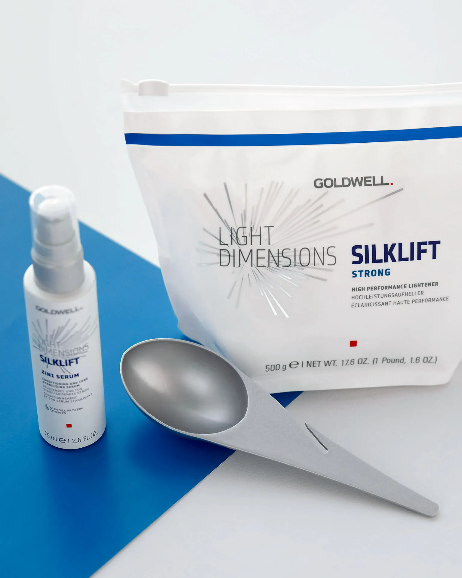 Goldwell Light Dimensions Silklift Strong ist eine professionelle Salon Blondierung für normales bis kräftiges und strapaziertes Haar. Die Hochleistungsblondierung ermöglicht eine Aufhellung um bis zu 9 Tonhöhen und garantiert aufgrund des Anti-Yellow Systems sehr klare und sehr helle Ergebnisse. Sie ist für Highlights, Ansatzaufhellung und Blondierwäsche geeignet. Das Haar wird durch die Shield Technologie geschützt. So funktioniert die Blondierung mit Goldwell Light Dimensions Silklift Strong Haare müssen vor der Anwendung trocken sein. Standardmenge: 35ml Entwickler Lotion mit 25g Goldwell Light Dimensions Silklift Strong und 3 Pumpstößen Silklift 2in1 Serum gut vermischen. Die Mischung gleichmäßig mit einem Pinsel auftragen. Maximal 45 Minuten ohne Wärme einwirken lassen. Anschließend gründlich mit Shampoo auswaschen und die Haare mit einer geeigneten Pflegespülung oder Kur behandeln.