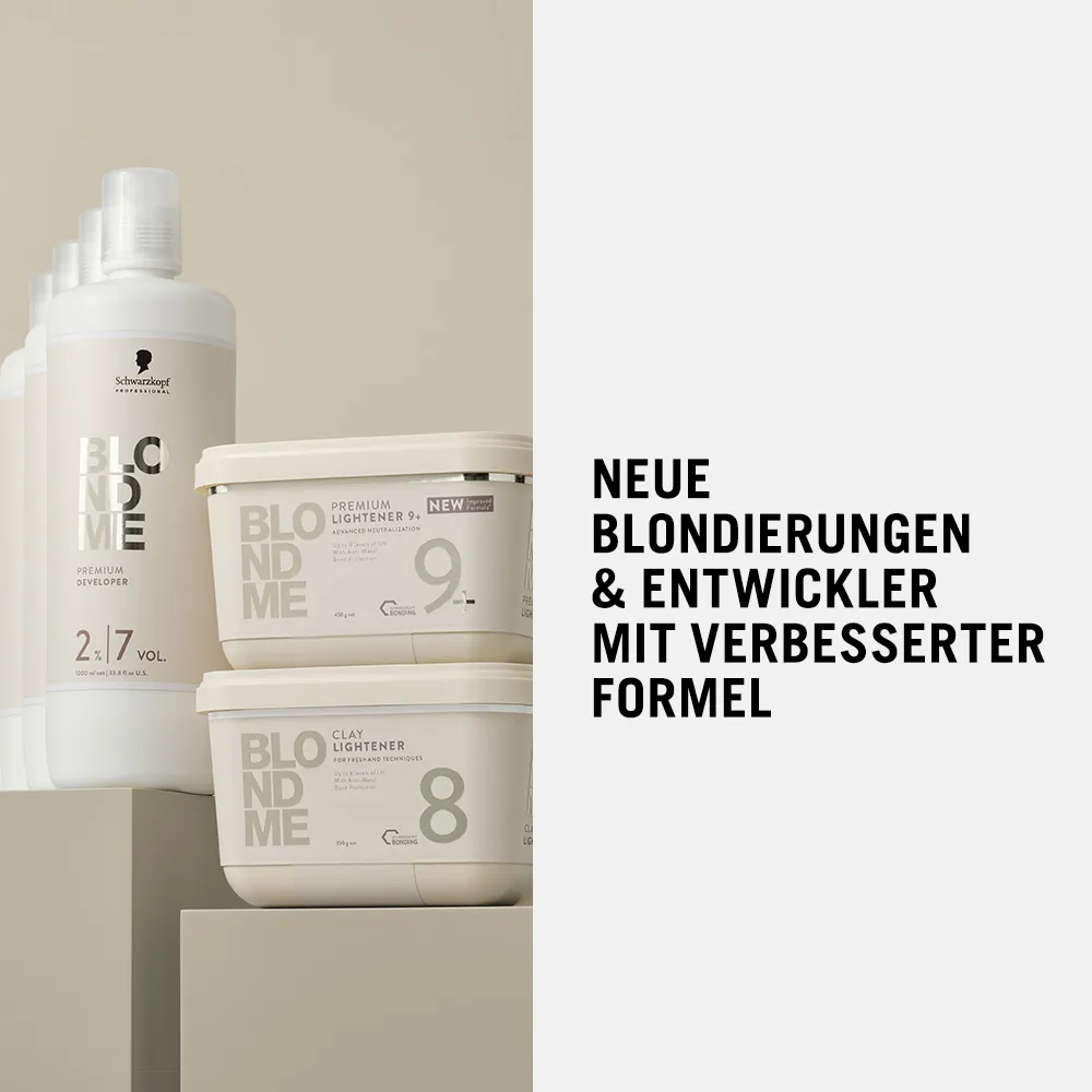 Der BlondMe Premium Lightener 9+ von Schwarzkopf ist ein Blondierpulver, das eine Aufhellung von bis zu 9 Stufen ermöglicht. Es ist für alle Techniken geeignet und kann mit den BlondMe Premium Entwicklern mit 2%, 6% und 9%* verwendet werden.Schwarzkopf Blondme Premium Lightener: Sanfte Blondierung für maximale AufhellungsergebnisseDer Premium Lightener mit Bond Enforcing Technologie minimiert Haarbruch mit dem Bond Protection System, mit dem die Haarfaser während des Blondierungsprozesses aktiv geschützt wird.So ermöglicht die Blondierung schonende, äußerst helle und klare Ergebnisse. Das Blondierpulver von Schwarzkopf schützt die Faserverbindungen aber nicht nur, sondern baut auch neue während der Blondierung auf. Die Premium Blondierung sorgt so für stärkste Aufhellung bei maximaler Haarschonung.Anwendungstipps für Schwarzkopf Blondme Premium Lightener 9+Auf das trockene Haar auftragen.Geeignet für Anwendung mit und ohne Kopfhautkontakt.Für Globalanwendungen, Folientechniken und Farbkorrekturen.Die sanfteste Aufhellung um bis zu 3 Stufen ist mit dem Developer 2% 7 Vol. möglich.Mit dem Developer 6% 20 Vol. ist die Aufhellung bis zu 6 Stufen möglich.Mit dem Deveolper 9% 30 Vol. ist die Aufhellung bis zu 9 Stufen möglich (nur Anwendung ohne Kopfhautkontakt).20-45 Minuten einwirken lassen.Resultat mit Schwarzkopf Blondme Premium Lightener 9+bis zu 9 Stufen Aufhellungkühles Blond ohne Gelbstichgesundes HaarNeue Faserverbindungenminimierter HaarbruchAusgezeichnete Haarqualität*nur ohne Kopfhautkontakt verwenden. Die leistungsstarke Aufhellung legt besonderen Wert auf den Schutz der Haarfaserverbindungen bei gleichzeitiger maximaler Aufhellung.