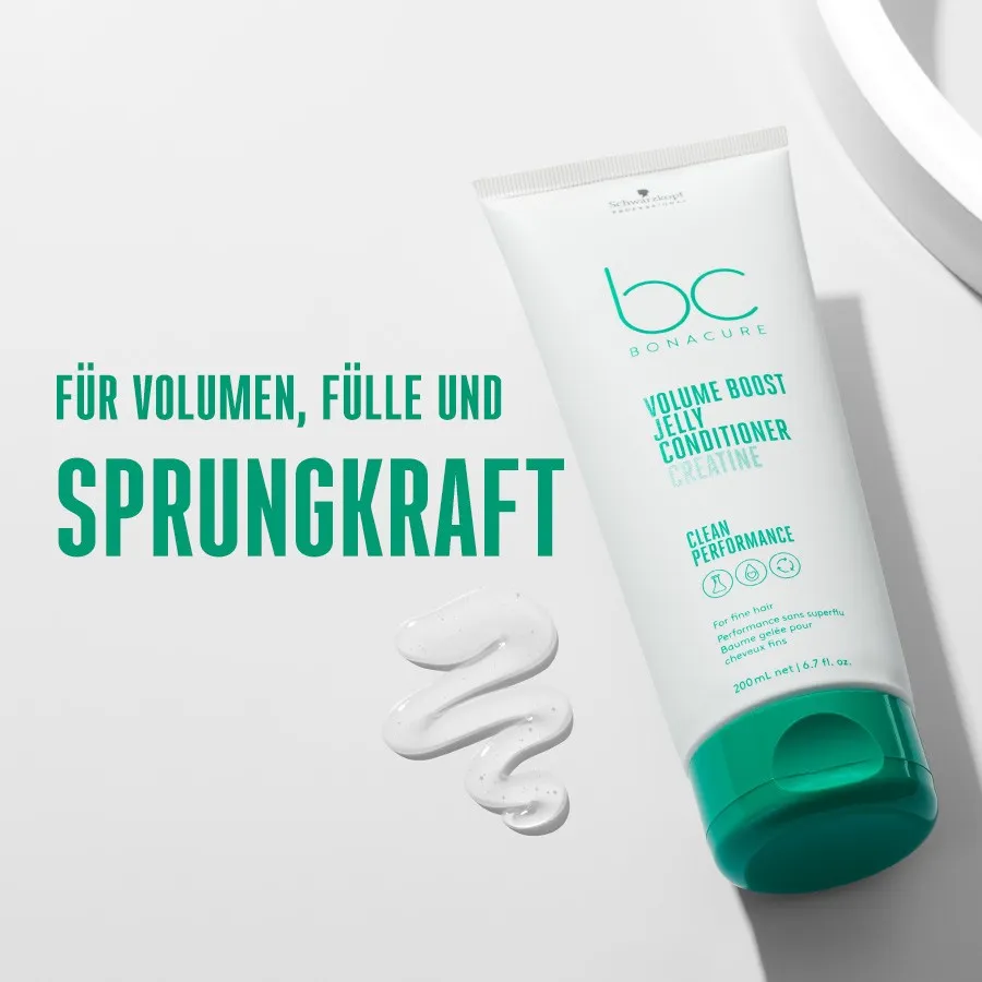 Schwarzkopf BC Bonacure Volume Boost Jelly Conditioner  ist der leichte gelartige Conditioner speziell formuliert für feines Haar. Er sorgt für mehr Volumen und Fülle und gibt bis zu 48 Stunden ein volleres Haargefühl.  Schwarzkopf BC Bonacure Volume Boost Jelly Conditioner: Verbessert das Volumen jeder Strähne Der Volume Boost Jelly Conditioner ist frei von Silikonen und künstlichen Farbstoffen. Dafür enthält er aufbauendes, veganes Keratin und volumengebendes Kreatin. Die schwerelose, gelartige Textur pflegt und entwirrt feines Haar, um die Elastizität wiederherzustellen und Volumen zu verleihen. Er hilft, statische Aufladung für eine verbesserte Kämmbarkeit. zu vermeiden. Die leichte Formulierung verbessert die innere Haarstärke und sorgt für ein volleres Haargefühl. Zusätzlich gibt er gesund aussehenden Glanz. Anwendung Schwarzkopf BC Bonacure Jelly Conditioner  2 Minuten im handtuch trockenen Haar einwirken lassen und gründlich ausspülen.  Veganes Haarprodukt.