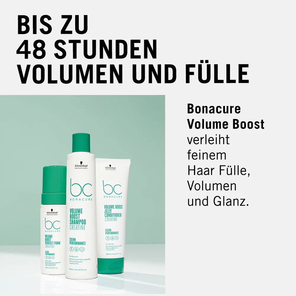 Schwarzkopf BC Bonacure Volume Boost Shampoo sorgt für mehr Volumen und bis zu 48 Stunden für ein volleres Haargefühl. Formuliert für feines und kraftloses Haar, verleiht es Volumen, Fülle und Sprungkraft. Schwarzkopf BC Bonacure Volume Boost Shampoo: Neue Technologie für gesundes & voluminöses Haar Das Shamooo ist mit der fortschrittlichen Technologie des veganen Pflegekomplexes mit veganer Keratin Alternative + Kreatin ausgestattet. Das Geheimnis von Bonacure Volume Boost ist die kombinierte Wirkung von veganem Keratin und Kreatin. Die Formulierung mit Keratin stellt die Haarfaser wieder her und sorgt  für Geschmeidigkeit und Kämmbarkeit. Zugleich wird jeder Strähne mit Kreatin sichtbar mehr Volumen, Fülle und Sprungkraft geschenkt. Schwarzkopf BC Bonacure Volume Boost Shampoo Wirkung Das Shampoo von Bonacure Volume Boost entfernt sanft überschüssiges Öl und Rückstände, die das Haar beschweren können. Pflegende Polymere werden hinzugefügt, um eine statische Wirkung zu verhindern, für eine bessere Kämmbarkeit der Haare und eine verbesserte Elastizität. Es ist frei von SLS/SLES Sulfaten, Silikonen und künstlichen Farbstoffen. Das Shampoo mit veganem Keratin verbessert die innere Haarstärke und sorgt für ein volleres Haargefühl. Hinzu kommt ein bis zu 48 Stunden volleres Haargefühl.