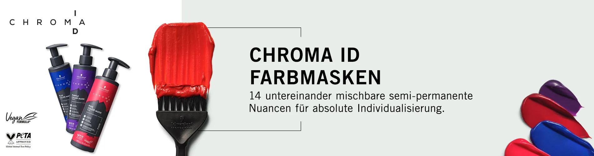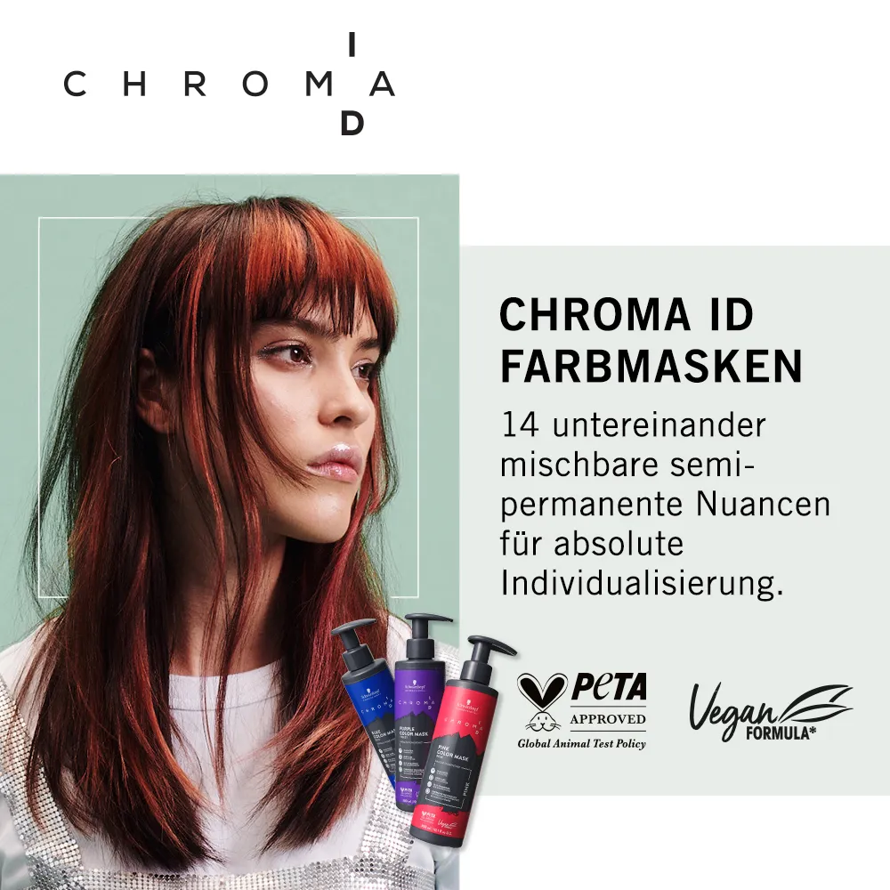 Farbe und Pflege in einer Maske! Entdecke CHROMA ID, Schwarzkopf Professionals erstes Mix & Tone-Farbsystem für maximale Farbintensität und keine Haarschädigung, ohne sich dauerhaft an eine Farbe zu binden.