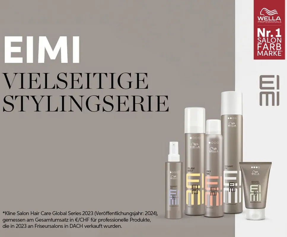 Eimi von Wella ist die professionelle Stylinglinie von Wella. Mit der Produktpalette für Glanz, Textur, Volumen, für glatteres Haar und ultrastarken Halt wird jedes Styling einzigartig. Egal ob langes Haar oder Kurzhaarschnitte - Eimi bietet für jeden Look das passende Stylingprodukt.
