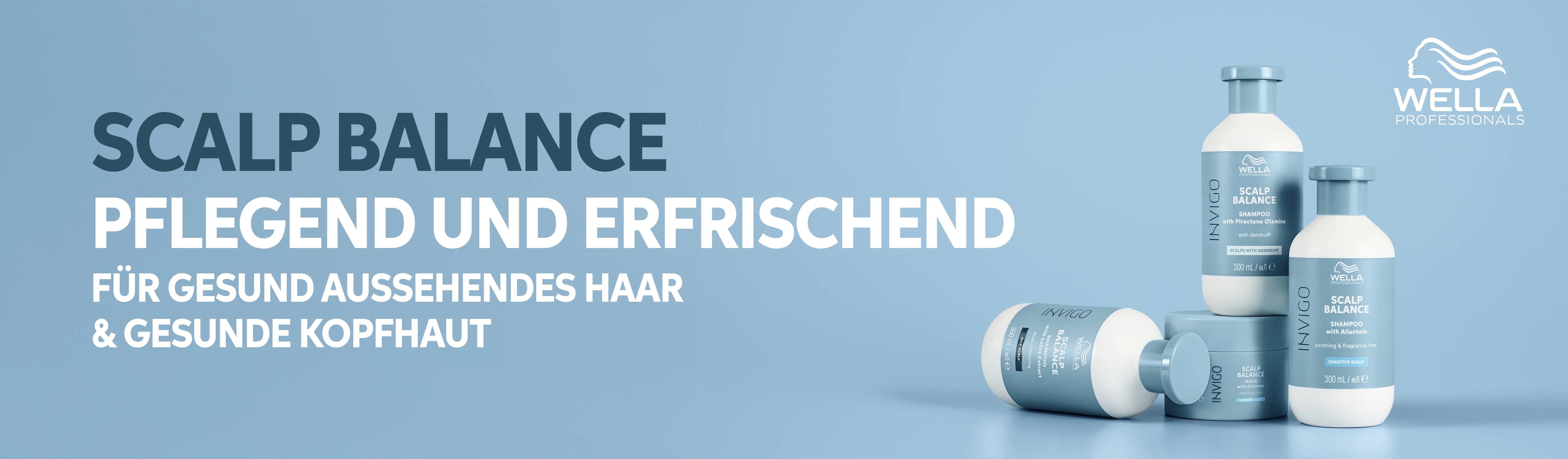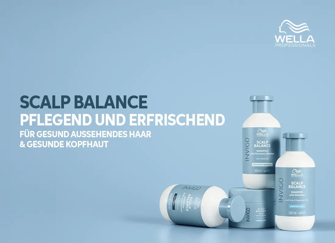 Eine gesunde Kopfhaut ist die Basis für schönes und schuppenfreies Haar. Die fortschrittlichen Produkte von Wella Scalp Balance sind darauf ausgelegt, die Kopfhaut in den Mittelpunkt zu stellen. Invigo Scalp Balance ist die effektive Lösung bei Problemen wie Schuppen, fettiger Ansatz, Spannungsgefühle oder Haarausfall. Die Produkte reinigen gründlich, aber sanft, während sie die Kopfhaut beruhigen, erfrischen und beleben. Sie verwöhnen aber nicht nur die Kopfhaut, sondern pflegen auch das Haar. Es fühlt sich sauber und gepflegt an und der angenehme Duft rundet das Haarpflege-Erlebnis ab. Die Produkte verleihen Glanz, Geschmeidigkeit und seidiges Haar. Die gesamte Kopfhaut-Pflegelinie von Wella ist in edlem Blau gehalten.